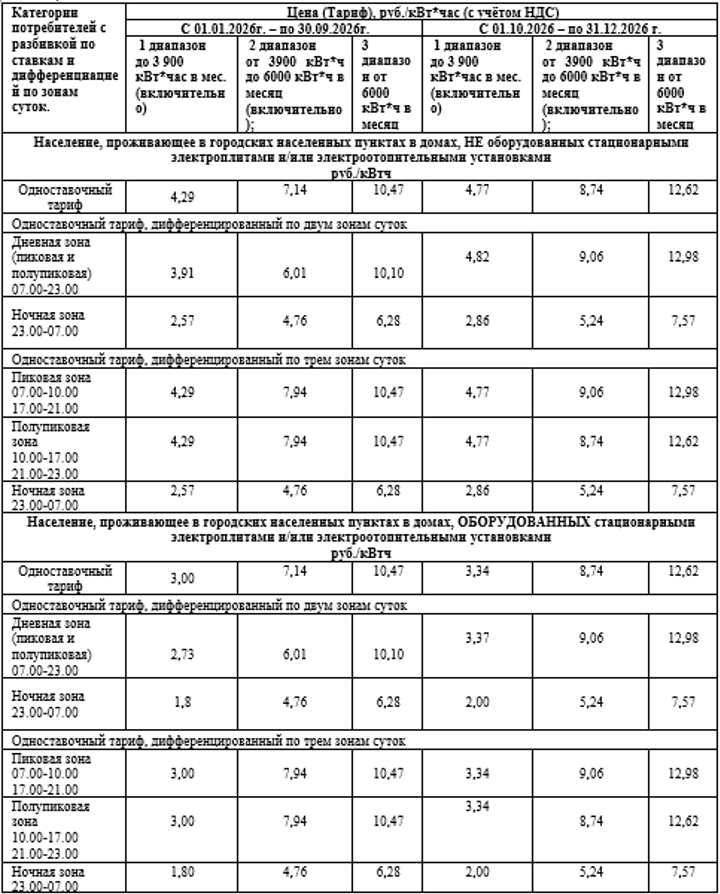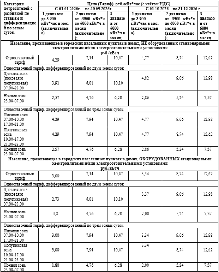 Для населения, проживающего в домах, оборудованных стационарными электроплитами и (или) электроотопительными установками (Основание: Распоряжение региональной энергетической комиссии Тюменской области, Ханты-Мансийского автономного округа – Югры, Ямало-Ненецкого автономного округа от 26.12.2025 №62).